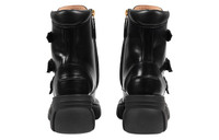 Crafted from shiny black leather, logo buckles add a contemporary feel to this pair of ankle boots. The style speaks to the influences from the world of sports and leisure that run through the House's designs with a chunky sole and padded details at the ankle. - Black leather - Women's - Ornamental Gucci buckles - Rubber sole - Side zip closure - 2.4" heel height with 0.8" platform, based on a size 37 (IT) - Made in Italy
