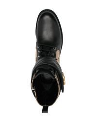 GG-canvas logo-plaque combat boots Gucci references the brand's heritage in a contemporary way in this pair of ankle boots. Featuring a gold-tone hardware logo plaque at the side and the brand's GG monogram as contrast-panel detailing, the design also ties in with current branding trends in a sophisticated way. Highlights - Beige/black - Leather - Logo plaque - Gold-tone hardware - Classic gg canvas - Ankle-length - Front lace-up fastening - Round toe - Pull-tab at the heel Made in Italy Composition Lining: Fabric 100%, Calf Leather 100% Outer: Calf Leather 100%, Fabric 100% SIZE & FIT Measurement CIRCUMFERENCE 14.96 in(38 cm) HEEL 1.57 in(4 cm) HEIGHT 5.9 in(15 cm)