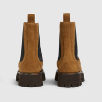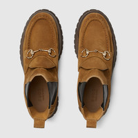 Defined by the Horsebit detail, a historical Gucci code, this ankle boot's silhouette pays homage to the equestrian world of the House. Crafted in smooth suede, the design is furthermore enhanced by the light gold-toned hardware. - Light brown suede - Light gold-toned hardware - Horsebit - Rubber lug sole - Elastic insert - Height: .5" - Made in Italy