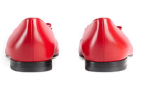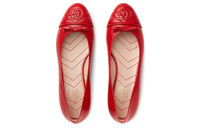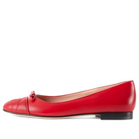 A historical design that can be traced back to the French revolution, the ballet flat is reincarnated for Gucci Aria through whimsical details and House codes. The shoe is presented in smooth red leather with a geometric matelassé detail at the front. Giving the style a logo feel, the initials of Guccio Gucci appear as an intricate stitched detail while a bow completes the design. - Red leather with matelassé chevron insert - Women's - Stitched Interlocking G detail - Bow - Leather sole - Flat - .4" heel height - Made in Italy