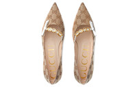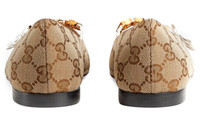 A historical design, the ballet flat is reincarnated for Gucci Aria through whimsical details and House codes. The shoe is presented in Original GG canvas with a bow detail at the front. Giving the style a logo feel, the name of the House appears as a charm-like detail. - Beige and ebony Original GG canvas - Women's - Leather sole - Braided leather detail with 'GUCCI' - Bow - Point toe - Height: .4" - Made in Italy
