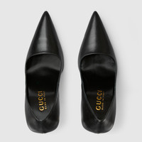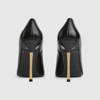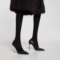 Introducing Spring Summer 2026. This style is featured in several looks of La Famiglia, which pays tribute to a glamorous era. Crafted from smooth leather, the new pump design is defined by a point toe and stiletto heel in gold-toned finish. - Black smooth leather - Black leather lining and insole - Point toe - Black leather outsole - Gold-toned steel stiletto heel - High heel - Height: 4.3" - Made in Italy