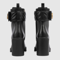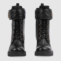 Paying tribute to both the past and present, this women's heeled boot is presented in a black leather and a chevron leather trim The shoe is completed by the Double G hardware— accentuating its shape with a logo feel. - Black leather - Women's - Gold-toned hardware - Black chevron matelassé leather - Double G - Lace-up detailing - Rubber sole - Ankle strap with velcro closure - Heel loop pull - Side zip closure - Mid-heel - 3.3" heel height with 1.2" platform, 6" shaft, based on a size 37(IT) - Made in Italy