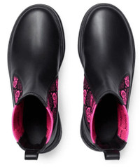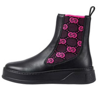 The House monogram is celebrated in new ways each season as a tribute to both the past and future. This pair of boots is crafted in black leather and defined by the GG jersey insert in vibrant fuchsia. - Black leather - Women's - Fuchsia GG stretch jersey insert - Leather loop at the back - 'Gucci' detail on the heel - Rubber sole - Flat - Made in Italy