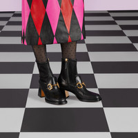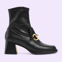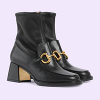 A historic symbol of the House, the Horsebit is presented on an ankle boot in smooth black leather. A gold-plated block heel add s a refined touch to the style. - Black smooth leather and stretch leather - Women's - Horsebit detail - Gold plated block heel - Side zip closure - Mid-heel - 2.1" heel height; 6.3" shaft, 9" circumference - all measurements based on a size 37 (IT) - Made in Italy