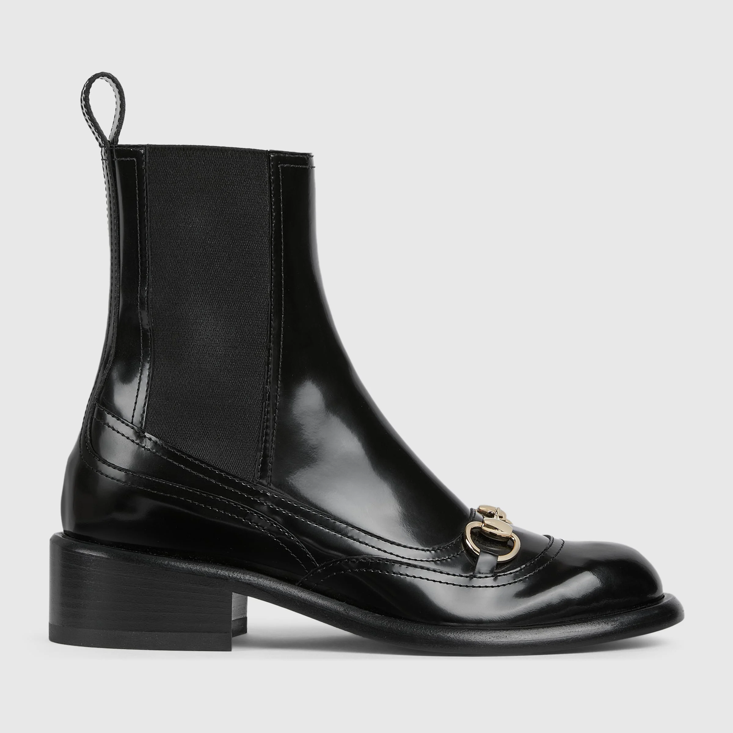 In the Fall Winter 2025 collection, Gucci continues to feature archival symbols. For the latest collection, the Horsebit hardware recalls the House's equestrian heritage. This pair of women's boot is crafted in patent leather and defined by a light gold-toned hardware. - Black patent leather - Light gold-toned hardware - Horsebit - Leather sole - Brogue details - Low heel - Height: 1.3" - Made in Italy