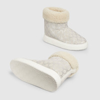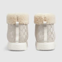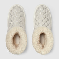 This pair of boots is crafted from silver and grey GG suede, a modern reinterpretation of a material deeply rooted in Gucci's heritage. The design is further distinguished by a luxurious Merino trim, adding a touch of warmth and texture. A rubber sole adorned with the iconic GG logo completes the look. - Silver and grey GG suede - Women's - Merinos trim - Leather lining - Rubber sole with GG - Flat - Height: 1.6" - Made in Italy