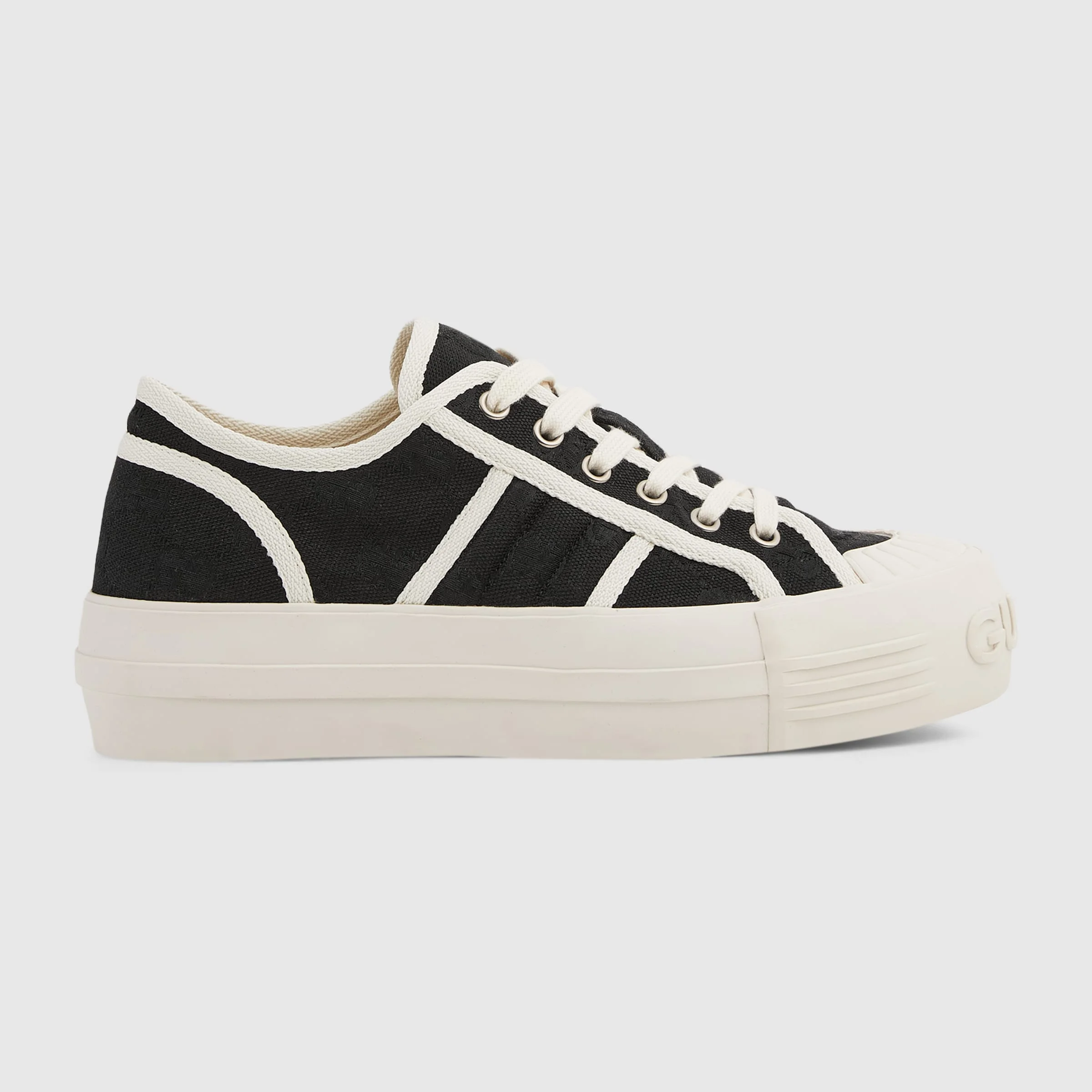 Expertly crafted from signature GG canvas, these trainers blend heritage design with modern aesthetics. The bold silhouette is elevated by a "Gucci" embossed rubber sole, ensuring a statement-making look and exceptional comfort. - Black GG canvas - Women's - Contrasting trim - Fabric lining - Rubber toe cap - Padded Web detail - 'Gucci' rubber sole - Low heel - Height: 1.5" - Made in Spain
