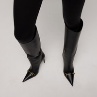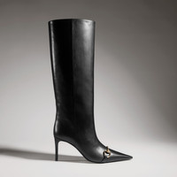 This style is part of the Gucci Primavera collection. The Donna makes its presence felt with striking clarity. The slip-on boot highlights a point toe and stiletto heel in a sensual design, accented with the emblematic Horsebit in gold-toned finish for a signature touch. - Black soft leather - Gold-toned hardware - Tonal lining - Horsebit - Point toe - Stiletto heel - Tonal sole - Mid heel - Height: 3.1"; shaft: 14.8"; circumference: 15.9", based on a size 37 (IT) - From 34-42, the shaft increases by ~0.2" and circumference by ~0.3" per size - Made in Italy