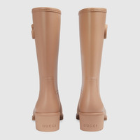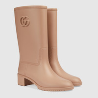 Perfect for a rainy day, this pair of heeled boots is crafted from water-resistant rubber in earthy tones, complemented by a tonal Double G and Gucci lettering across the heel. - Light brown rubber - Women's - Double G - Embossed Gucci logo at heel - Round toe - Rubber sole - Low heel - Made in Italy