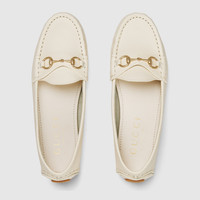 Now an emblem of the brand, the leather driver loafer is both a statement piece and a classic accessory. A shoe that appears throughout the House's collections, the style reflects the preppy narrative that animates designs. - Ivory grainy leather - Women's - Light gold-toned hardware - Leather lining - Horsebit - 'Gucci' rubber sole - Flat - Made in Italy