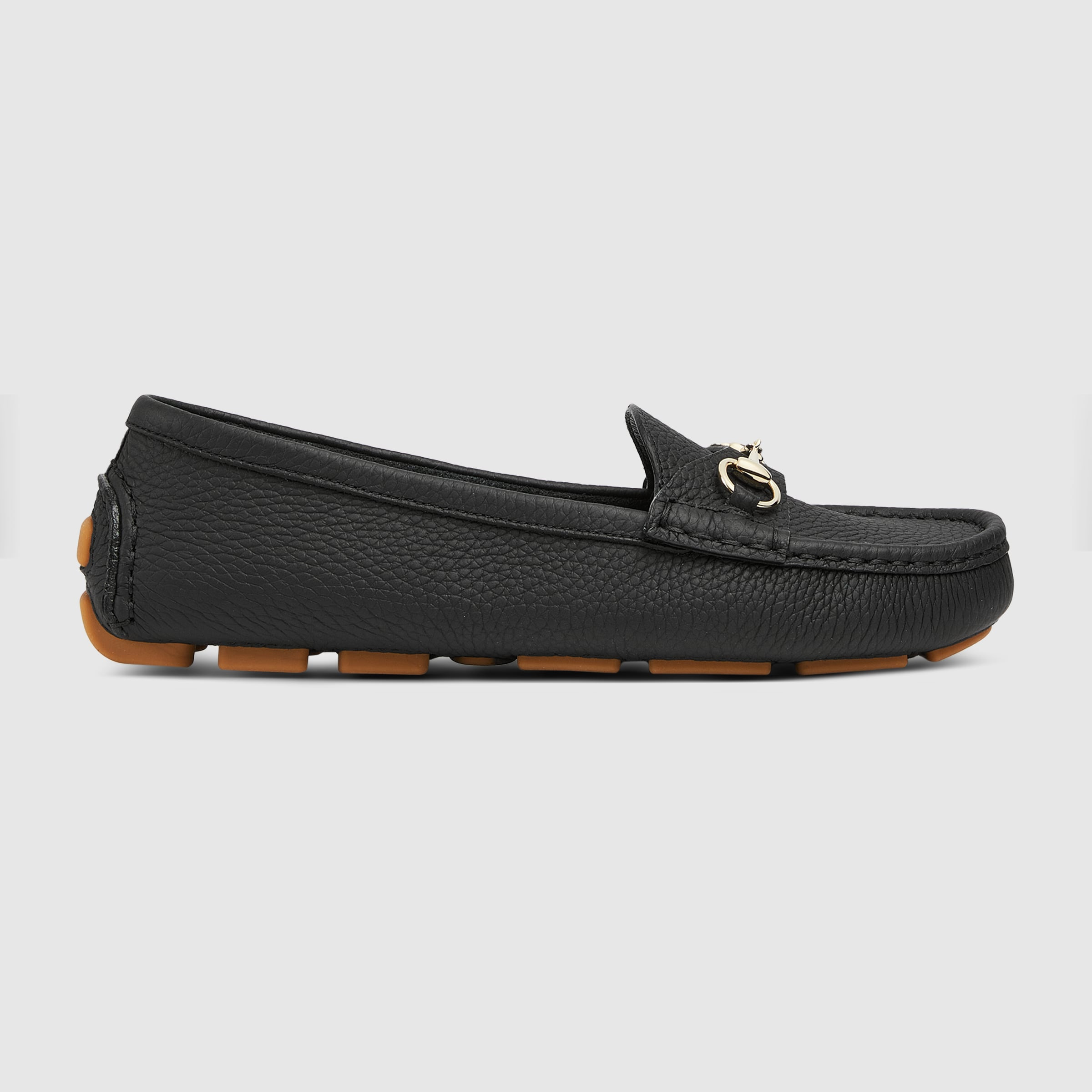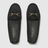 Now an emblem of the brand, the leather driver loafer is both a statement piece and a classic accessory. A shoe that appears throughout the House's collections, the style reflects the preppy narrative that animates designs. - Black grainy leather - Women's - Leather lining - Horsebit - 'Gucci' rubber sole - Flat - Made in Italy