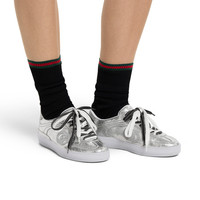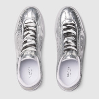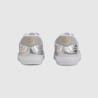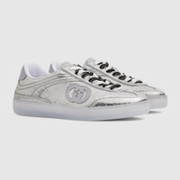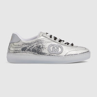 The G75 sneaker pays tribute to the year 1975 when the House patented the Interlocking G, featured in this silhouette. With its tennis-inspired look, this style is further elevated with uniquely textured leather. - Metallic silver textured leather - Fabric lining - Interlocking G logo - Lace-up closure - Flat - Height: 0.1" - Made in Italy