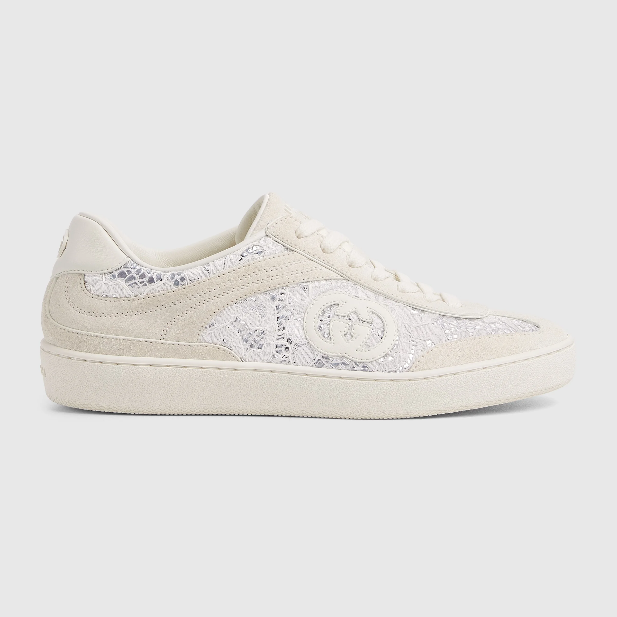 The G75 sneaker is crafted from supple suede, exuding a sophisticated yet modern appeal. The streamlined silhouette is elegantly enhanced by the signature Interlocking G logo, adding a refined touch to the design. - White suede - Women's - Silver metallic leather trim - Interlocking G logo - Additional pair of laces included - Lace-up closure - Flat - Heigth: 0.1" - Made in Italy