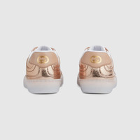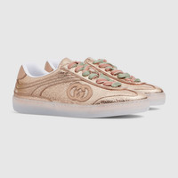 The G75 sneaker pays tribute to the year 1975 when the House patented the Interlocking G, featured in this silhouette. With its tennis-inspired look, this style is further elevated with uniquely textured leather. - Light bronze metallic textured leather - Fabric lining - Interlocking G logo - Lace-up closure - Flat - Height: 0.1" - Made in Italy