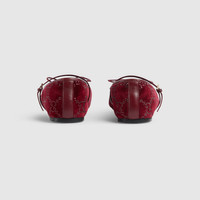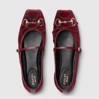 The signature Horsebit ballerina pays homage to the original ballet shoe silhouette. Defined by a squared tucked toe cap and the delicate bow detail, this style is crafted in soft velvet with GG crystal motif, highlighting a light gold-toned Horsebit. The "sacchetto" construction and softly padded insole ensure a high level of comfort. - Gucci Rosso Ancora red GG crystal velvet - Gucci Rosso Ancora red leather trim - Light gold-toned hardware - Leather lining - Horsebit - Leather bow detail - Leather sole - "Sacchetto" construction - Strap closure with adjustable buckle - Flat