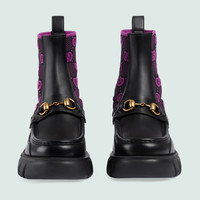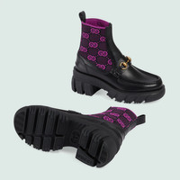 Instantly recognizable emblems of the brand, logos enrich designs in new and unexpected ways. Behind every logo lies the tradition and value of the House, an everlasting medium one can wear again and again. Following the idea of constant change and experimentation, different iterations of the logo have been presented each collection. This boot is defined by the gold-toned Horsebit and the GG jersey insert. - Black leather - Women's - Gold-toned hardware - Fuchsia GG stretch jersey insert - Horsebit - Leather loop at the back - Low heel - Made in Italy