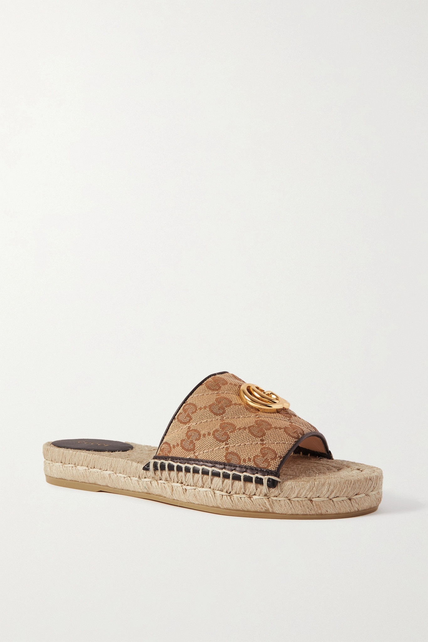 EDITORS'NOTES Gucci's 'Pilar' espadrilles have been reworked in a new silhouette, though they still feel distinctly '70s. They've been made in Spain from the house's signature matelassé 'GG' canvas and trimmed with black leather. The gold logo is taken from the era they're so inspired by. DETAILS & CARE - Sole measures approximately 20mm/ 1 inch - Beige and dark-brown canvas, black leather (Calf) - Slip on