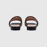 A signature Gucci shoe reimagined with a strong logo connotation for Spring Summer 2020. Defined by the archival Double G hardware from the '70s, the slide sandal is presented in diagonal matelassé Original GG canvas—a timeless pairing that pays homage to the House's heritage. - Beige/ebony diagonal matelassé Original GG canvas - Black leather trim - Shiny gold-toned hardware - Leather lining with Gucci print - Double G - Square toe - Leather sole - Flat - .6" heel height - Made in Italy