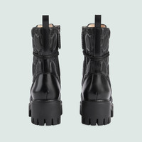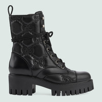 Reminiscent of mountain wear, this pair of ankle boots has a chunky silhouette enhanced by a defined lug sole. Crafted from black GG Matelassé leather, the design is defined by hiking-inspired laces. - Black GG Matelassé leather - Women's - Smooth black leather trim - Loop detail at the back - Lug rubber sole - Lace-up closure - Low heel - 2.4" heel height ; 7" shaft, 9.3" circumference - all measurements based on a size 37 (IT) - Made in Italy - Additional pair of laces included