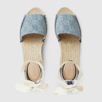 The GG denim line expands to include a range of women's shoes for the new season. Three different GG denim shades in light blue, dark blue and black add texture to staple House styles. Here it defines this classic women's platform espadrille. - Light blue and ivory GG denim - Women's - Cord platform with rubber bottom - Grosgrain ankle tie - Mid-heel - Made in Spain