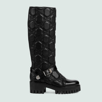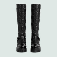 Introduced in Love Parade, the GG quilted leather is now presented on a selection of shoes defined by a strong logo feel. The name of the House also appears on the buckle of this pair of boots. - Black GG quilted leather - Women's - Smooth black leather trim - Buckle detail with Gucci engraving - Lug rubber sole - Low heel - Made in Italy