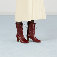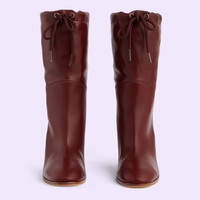 The House's logo symbols are reimagined each season, celebrated in different ways. This pair of sleek and sophisticated leather boots hides a signature logo detail, as the lining is crafted in GG shearling effect fabric. Worn in two different ways, the drawstring detail adjust the lift of the boot and completes the style. - Bordeaux leather - Women's - GG shearling effect fabric - Drawstring detail - Leather sole - Foldable - Made in Italy