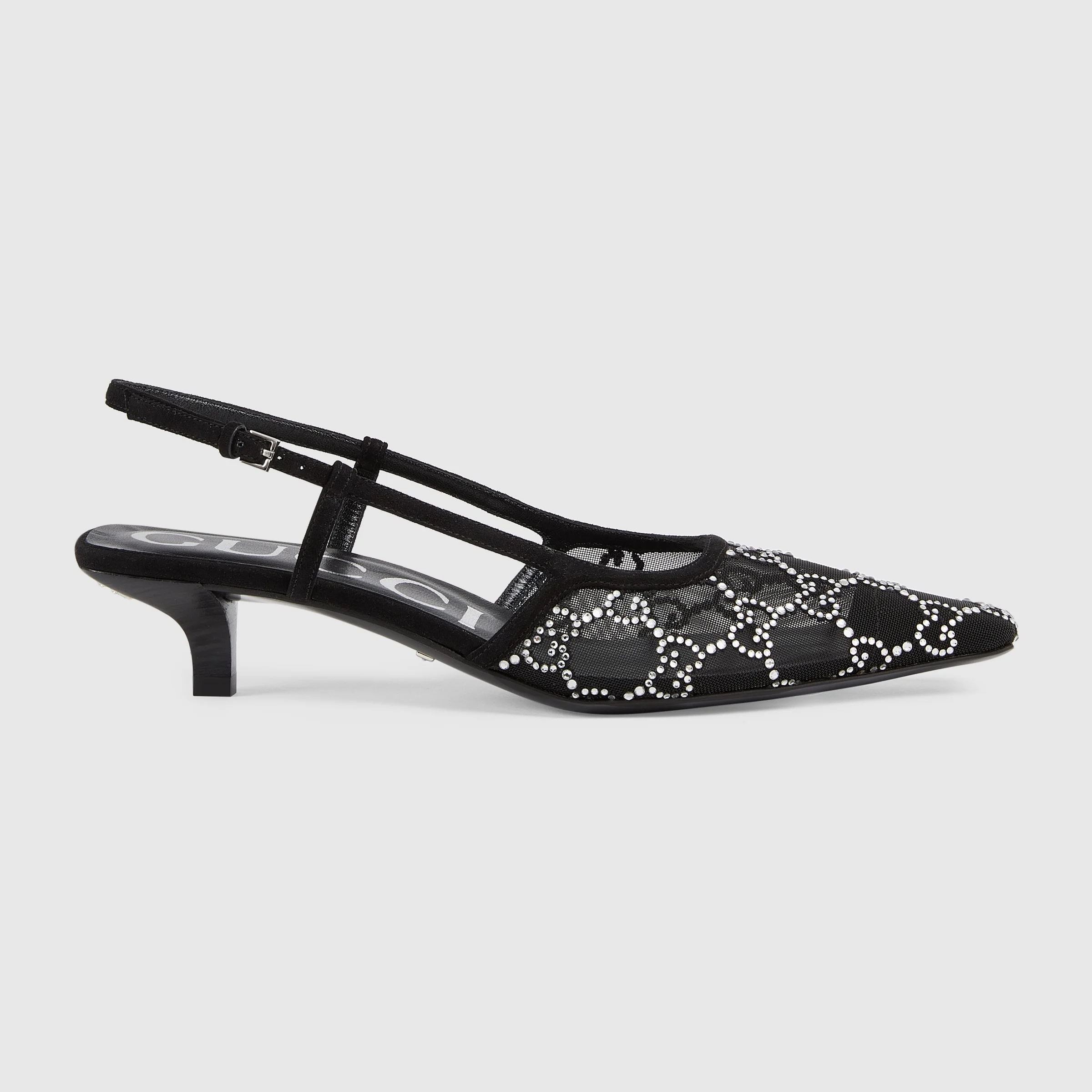 The Gucci Aria collection takes references from the archives of the '90s and early '2000s, with pieces inspired from Tom Ford's era in Gucci. The new idea of femininity shows glamorous details, such as lace, crystals and sheer fabrics. This pair of slingback shoes are presented in black mesh with a sparkling GG motif. - Black mesh with GG crystals - Women's - Tonal suede details - Leather sole - Back buckle closure - Low heel - 1.4" heel height - Made in Italy - Please note the absence of crystals near the sole is a technical detail which contributes to the durability of the design.