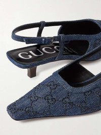 EDITORS'NOTES Gucci's 'Demi' slingback pumps are the chicest way to wear kitten heels this season. They're made from blue denim and embellished with crystals that form the brand's signature 'GG' monogram. SIZE & FIT - Fits true to size, take your normal size - Narrow at the toe - Italian sizing DETAILS & CARE - Heel measures approximately 35mm/ 1.5 inches - Dark-blue denim - Buckle-fastening slingback strap