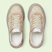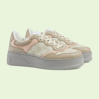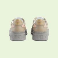 Pastel colors add a delicate note to the collection, adding a retro aesthetic to classic silhouettes. This pair of chunky sneakers is presented in a mix of different materials with an Interlocking G print at the back. An emblematic material, white and beige GG Supreme canvas is framed by oatmeal and light pink colored leather. - White and beige GG Supreme canvas - Women's - Oatmeal and light pink leather trim - Printed Interlocking G logo on the back - 'Gucci' rubber sole - Additional pair of laces included - Lace-up closure - Mid-heel - 2.2" height - Made in Italy