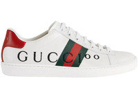 In honor of the Centennial, The Gucci Aria collection presents an homage to the brand's legacy. Reminiscent of the retro logo trend, this pair of Ace sneakers features a contrasting print that mixes the name of the House with 100. - White leather with Gucc100 print - Women's - Green and red Web - Red leather details at the back - Rubber sole - Lace-up closure - .6" heel height - Made in Italy