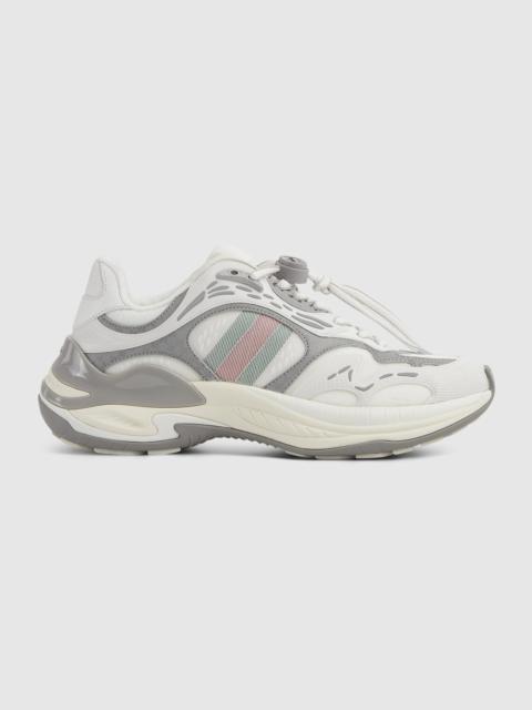 The Gucci 2.0 sneaker refreshes one of the House’s most recognizable emblems, the Web stripe. Featuring the new iteration of this signature detail, these sneakers are defined by a thick EVA sole with a dynamic silhouette that ensures a steady and comfortable stride. - Green and purple mesh and leather - Leather lining - Reflective material with GG trim - Padded Web - EVA rubber sole with GG - Lace-up closure with Interlocking G coulisse - Flat - Height: 0.4" - Made in Italy
