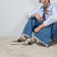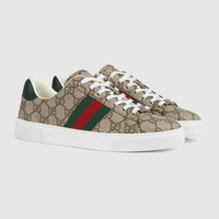 Since its debut, the Ace sneaker has become a mainstay of the House's narrative. A new version of the characteristic low-top silhouette is presented in the latest collection, featuring unique details. A chunkier construction defines the shape, while a metal “ACE” tag shines atop the lace-up closure. Gucci's distinctive green and red Web stripe completes the style. - Beige and ebony GG Supreme - Women's - Green and red Web - 'ACE' metal tag - Rubber sole - This Gucci Ace sneaker model fits true to size, please refer to the size guide. - Additional pair of laces included - Lace-up closure - Low heel - 1.2" height - Made in Italy