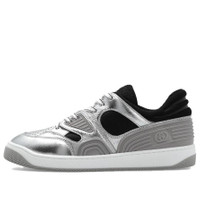 Sporting a look synonymous with basketball sneakers from the ‘90s, the House presents new interpretations of the Gucci Basket sneaker. This style emulates the self-expression of on-court aesthetic with distinctive features and detailing. Metallic leather defines this new iteration of this signature design. - Silver metallic leather - Grey rubber trim - Women's - Rubber sole - Rubber Interlocking G at the side - Lace-up closure - Low heel - 1.3" height - Made in Italy