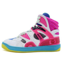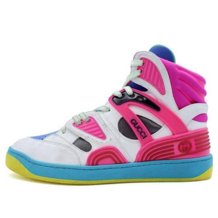Sporting a look synonymous with basketball sneakers from the ‘90s, the House introduces the newest rendition of the lace-up sneaker—Gucci Basket. This high-top style emulates the self-expression of on-court aesthetic with distinctive features and detailing. Offered in a mix of brightly colored fabrics and finished with a lightly distressed effect, each pair is crafted primarily from Demetra. Created with the same processes used for tanning, the new material offers pliable and resilient performance with a supple finish. The eco-friendly material combines animal-free raw materials primarily from sustainable, renewable, and bio-based sources. - White Demetra—crafted from animal-free raw materials that are primarily from sustainable, renewable, and bio-based sources with pink rubber details - Women's - Blue and grey mesh - Rubber Interlocking G patch - Contrast padding at the ankle - Gucci logo detail - Rubber Interlocking G at the side - Rubber sole - Lace-up closure - Low heel - 1" height - Made in Italy - Treated for a distressed effect