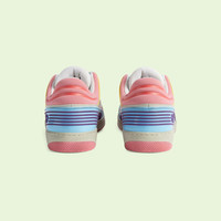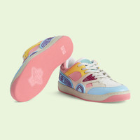Sporting a look synonymous with basketball sneakers from the ‘90s, the House introduces the newest rendition of the lace-up sneaker—Gucci Basket. This low-top style emulates the self-expression of on-court aesthetic with distinctive features and detailing. Offered in a mix of brightly colored fabrics and finished with a lightly distressed effect, each pair is crafted primarily from Demetra. Created with the same processes used for tanning, the new material offers pliable and resilient performance with a supple finish. The eco-friendly material combines animal-free raw materials primarily from sustainable, renewable, and bio-based sources. - Light blue Demetra—crafted from animal-free raw materials that are primarily from sustainable, renewable, and bio-based sources purple and white rubber details - Women's - White mesh - Rubber Interlocking G patch - Gucci logo detail - Rubber sole - Contrast padding at the ankle - Lace-up closure - Flat - Made in Italy