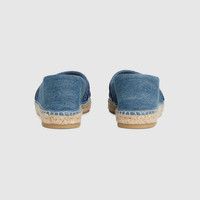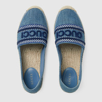 Crafted with exceptional attention to detail, these timeless shoes feature the signature "Gucci" embroidery that exudes sophistication and brand prestige. Designed with a comfortable yet stylish espadrille sole, they are perfect for warm-weather outing. - Light blue denim - Women's - Leather lining - 'Gucci' embroidery - Cord and rubber outsole - Flat - Made in Spain