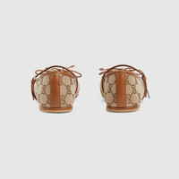 This iconic Horsebit ballet flat pays homage to the original ballet shoe silhouette defined by a squared tucked toe cap and the delicate bow detail. This style is crafted in Original GG canvas and defined by a light gold-toned Horsebit. The "sacchetto" construction ensures a high level of comfort, thanks also to the soft padded insole. - Beige and dark brown Original GG canvas - Women's - Light gold-toned hardware - Leather lining - Horsebit - Leather bow detail - Leather sole - "Sacchetto" construction - Soft padded insole - Leather strap closure with adjustable buckle - Flat - Made in Italy