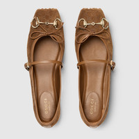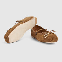 This iconic Horsebit ballet flat pays homage to the original ballet shoe silhouette defined by a squared tucked toe cap and the delicate bow detail. This style is crafted in shiny satin and defined by a light gold-toned Horsebit. The "sacchetto" construction ensures a high level of comfort, thanks also to the soft padded insole. - Light brown mini GG suede - Women's - Light gold-toned hardware - Leather lining - Horsebit - Leather bow detail - Leather sole - "Sacchetto" construction - Soft padded insole - Leather strap closure with adjustable buckle - Flat - Made in Italy
