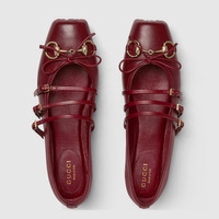 This iconic Horsebit ballet flat pays homage to the original ballet shoe silhouette defined by a squared tucked toe cap and the delicate bow detail. This style is crafted in Gucci Rosso Ancora red leather and defined by a light gold-toned Horsebit. The "sacchetto" construction ensures a high level of comfort, thanks also to the soft padded insole. - Gucci Rosso Ancora red leather - Women's - Light gold-toned hardware - Leather lining - Horsebit - Leather bow detail - Leather sole - "Sacchetto" construction - Soft padded insole - Leather 3 strap closure with adjustable buckle - Flat - Made in Italy