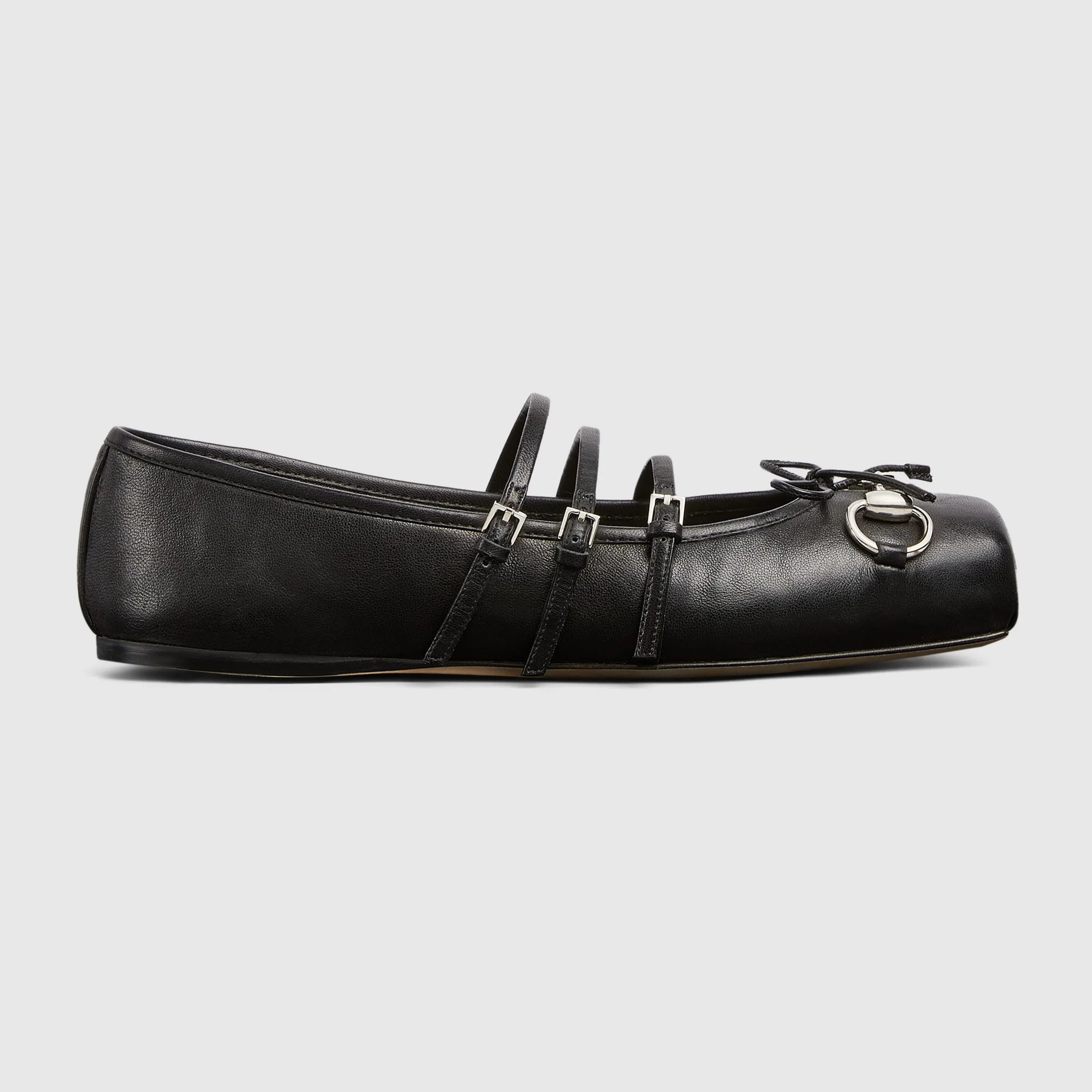 This iconic Horsebit ballet flat pays homage to the original ballet shoe silhouette defined by a squared tucked toe cap and the delicate bow detail. This style is crafted in black leather and defined by a silver-toned Horsebit. The "sacchetto" construction ensures a high level of comfort, thanks also to the soft padded insole. - Black leather - Women's - Silver-toned hardware - Leather lining - Horsebit - Leather bow detail - Leather sole - "Sacchetto" construction - Soft padded insole - Leather 3 strap closure with adjustable buckle - Flat - Made in Italy
