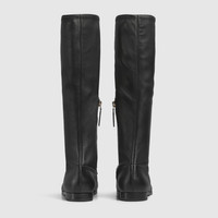 In the Spring Summer 2025 collection, the Gucci Jordaan introduces a modern boot silhouette, reinterpreting the House's signature loafer with a soft stretch leather shaft, offering comfort and elegance. - Black stretch leather - Women's - Light gold-toned hardware - Leather lining - Horsebit - Leather sole - Flat - 0.4" heel, 15" shaft; 12" circumference at top, 11.8" at calf, 8.1" at ankle - all measurements based on a size 37 (IT) - Made in Italy