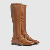 In the Spring Summer 2025 collection, the Gucci Jordaan introduces a modern boot silhouette, reinterpreting the House's signature loafer with a soft stretch leather shaft, offering comfort and elegance. - Brown stretch leather - Women's - Light gold-toned hardware - Leather lining - Horsebit - Leather sole - Flat - 0.4" heel, 15" shaft; 12" circumference at top, 11.8" at calf, 8.1" at ankle - all measurements based on a size 37 (IT) - Made in Italy
