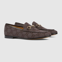 The Jordaan loafer with Horsebit is representative of Gucci heritage. This style is crafted in GG canvas, highlighting its refined, streamlined silhouette as the ultimate statement of everyday elegance. - Dark brown GG canvas - Light gold-toned hardware - Leather lining - Leather sole - Horsebit detail - Flat - 0.5" heel - Made in Italy