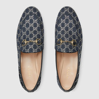 The Jordaan loafer with Horsebit, representative of Gucci heritage, speaks of classic elegance. This model crafted in precious GG crystal denim is completed with a new insole with extra cushioning, ensuring maximum comfort. - Dark blue GG crystal denim - Light gold-toned hardware - Horsebit - Leather sole - Flat - Height: .5" - Made in Italy