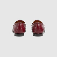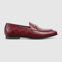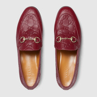 The Jordaan loafer with Horsebit, representative of Gucci heritage, speaks of classic elegance. This model boasts the Maison’s iconic monogram leather, a timeless emblem of distinction. With its supple materials and refined, streamlined silhouette, this shoe is the ultimate statement of everyday elegance. - Gucci Rosso Ancora red GG leather - Women's - Light gold-toned hardware - Leather lining - Horsebit - Leather sole - Flat - 0.5" heel - Made in Italy