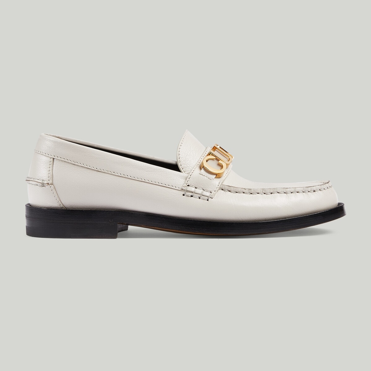 Crafted from white leather, this loafer is defined by a metal Gucci logo on the front. The gold-toned hardware pays homage to the Maison and enhances the classic silhouette of this style. - White leather - Women's - Gold-toned hardware - Metal Gucci logo - Metallic sunray print on insole - Leather sole - Low heel - .6" heel height - Made in Italy