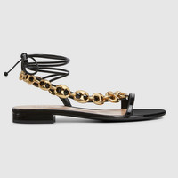 The Marina Chain is a signature design from 1960s, inspired by the glamorous world of yatching. The elegant detail defines here this pair of strappy sandal, crafted by soft and supple leather. - Black leather - Women's - Gold-toned hardware - Gucci Marina chain detail - Leather sole - Strappy ankle closure - Flat - Made in Italy