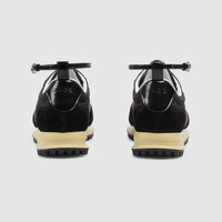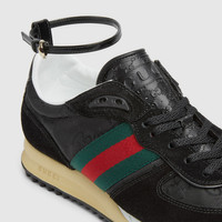 This sneaker features an adjustable and detachable ankle strap on the sporty silhouette. The lightweight, flexible outsole has gone through a special treatment to create a retro appeal. The signature green and red Web completes the model. - Black suede - GG nylon - Green and red Web - Fabric lining - Detachable and adjustable ankle strap - Rubber outsole with Interlocking G and Gucci script logo - Interlocking G details on the eyelets - Tongue with 3D Gucci script logo and Interlocking G, created with a high-frequency embossing process - Lace-up closure - Made in Italy - This style model fits true to size, please refer to the size guide