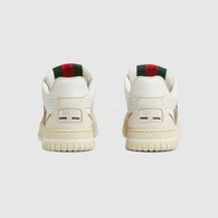 The first sneakers envisioned by Sabato De Sarno for the House, the Re-Web sees Gucci’s heritage stripes as a bold statement detail on a contemporary silhouette. This pair is crafted from the iconic Original GG canvas and white leather. Defined by multiple iconic details, this new sneaker takes center stage with the bold green and red Web tongue. - Beige and ebony Original GG canvas - Women's - White leather trim, treated with a specific process to make it soft and shiny, while the grainy texture is given by embossing - Rubber outsole with Interlocking G and Gucci script logo - Gucci script and Interlocking G Web tag - Interlocking G details on the eyelets - Stitching detailing recalling the Web - Tongue with Web - Additional pair of laces included - Lace-up closure - Low heel - Made in Italy - These shoes run big, we recommend sizing down half a size